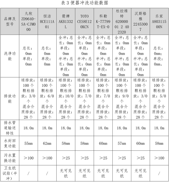 冲洗功能是智能坐便器的一个重要性能指标。不合格的产品,在使用一段时间后,在水流无法到达的位置易出现污物残留,产生异味,滋生病菌,同时易降低坐便器防臭能力,也易造成坐便器排污口堵塞,影响使用。根据GB/T 6952-2015《卫生陶瓷》标准测试8个样本冲洗功能,全部符合标准要求。