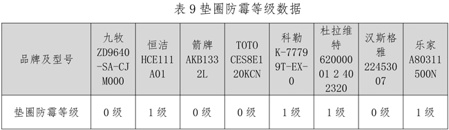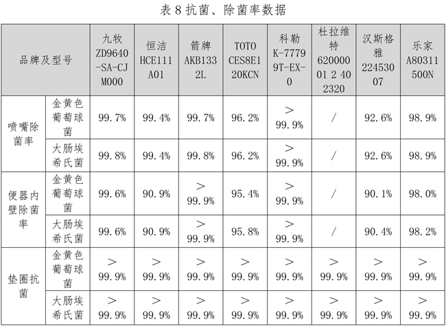 本次比较试验对喷嘴除菌率、内壁除菌率、垫圈抗菌率、垫圈防霉等级进行了测试。结果显示,8个样本的喷嘴除菌率、内壁除菌率均达到了90%以上,其中科勒、九牧、箭牌两项指标均大于99%。8个样本的垫圈抗菌率均大于99.9%,垫圈防霉等级均满足GB/T 23131-2019《家用和类似用途电坐便器便座》中规定的至少达到1级的要求。