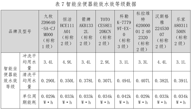 能效水效等级是考核智能坐便器节水性能的最直观指标。此项标准不合格的产品,会造成不必要的水资源浪费。GB 38448-2019对智能坐便器能效水效限定值及等级进行了明确规定,且划分为1、2、3级,并要求产品应张贴水效等级标识。测试结果显示,8个样本全部符合明示水效标识要求。