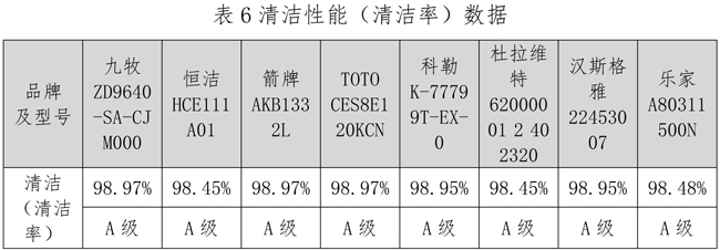 清洁率是指智能坐便器的臀洗功能。GB/T 23131-2019《家用和类似用途电坐便器便座》中规定,清洁率应不低于90.0%,且分为A、B、C、D四个等级,界值分别为:98.0%、96.0%、93.0%、90.0%。测试结果显示,本次8个样本的清洁率均在98.45%~98.95%之间,均达到了A级。