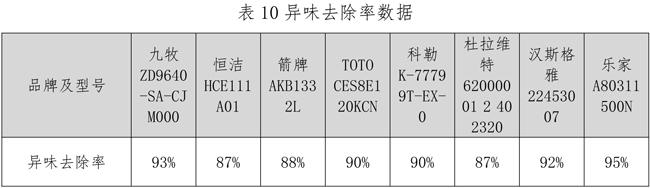 本次比较试验,以氨气模拟异味物质,对8个样本除异味能力进行了测试。结果显示,8个样本的异味去除率均在87%以上,其中乐家、九牧、汉斯格雅达到90%以上。