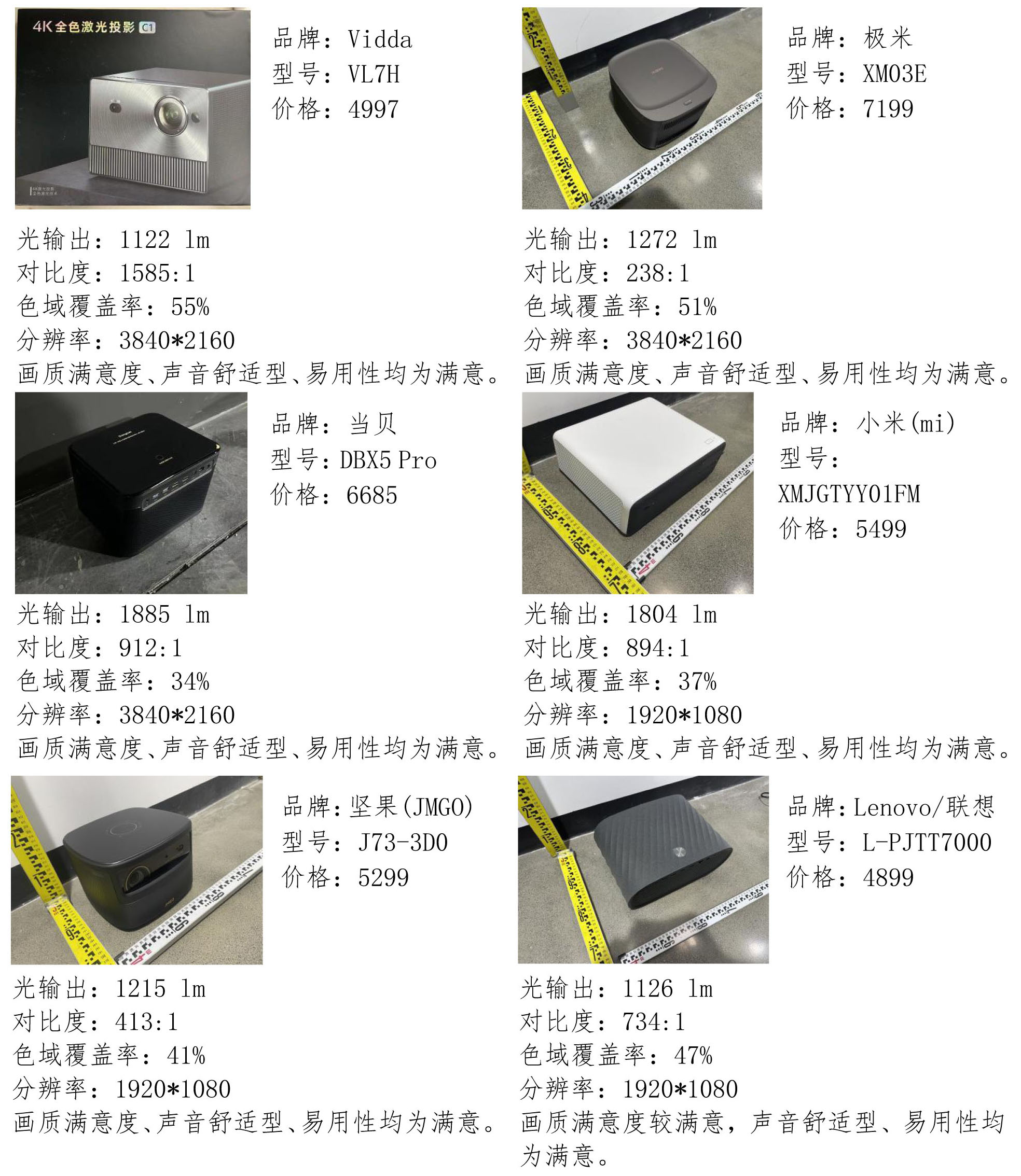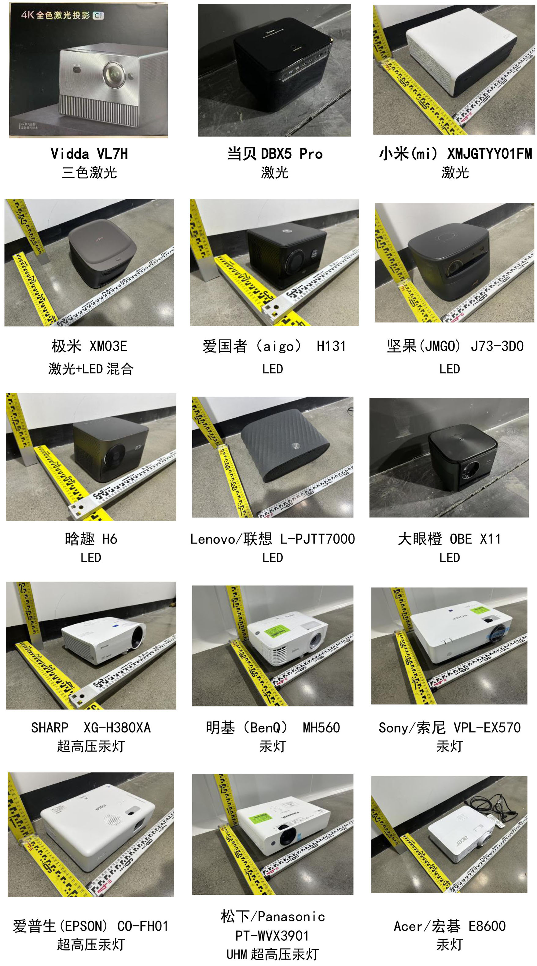 比较试验样品由北京市消费者协会的工作人员以普通消费者的身份从电商平台购买了15个品牌的产品,主要来自天猫、淘宝、京东、苏宁易购、抖音等平台,购买价格从4599元/台到7199元/台,光源类型有激光、LED、激光+LED混合、汞灯四种,基本覆盖了市面上的所有类型。
