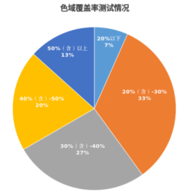 色域覆盖率指色彩覆盖的范围,测量三基色(红、蓝、绿)投射出的最大色域面积占CIE1976均匀色彩空间全部光谱轨迹所对面积的百分比,数值越高,相对画质越好越鲜艳。本次对购买的15台投影机产品进行检验,有10款未明示色域覆盖率,测试结果中色域覆盖率20%以下的样品1台,色域覆盖率20%(含)-30%之间有的样品5台,色域覆盖率30%(含)-40%之间有的样品4台,色域覆盖率40%(含)-50%之间有的样品3台,色域覆盖率50%(含)以上有的样品2台,相对来说色域覆盖率越高,颜色呈现程度越浓郁,色域覆盖率越低,颜色呈现程度越寡淡。