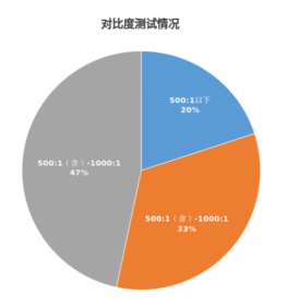 对比度是指投影机输出图像中最亮区域与最暗区域的亮度比值,能够影响投影机的灰度层次表现和色彩层次表现,一般来说,对比度越高,画面景深越大也就会越生动立体。本次对购买的15台投影机产品进行检验,本次在出厂默认状态下进行测试,故本次测试结果未与明示对比度进行比较,其中有3台样机对比度在500:1以下,5台样机对比度在500:1(含)-1000:1之间,7台样机对比度在1000:1(含)以上。