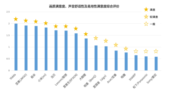 投影仪的使用方式是否简单、易学也是影响用户体验感的重要因素。易用性指标由工程师记录用户完成产品操作任务的任务绩效;以及用户通过产品任务操作对投影仪的易用性(开关机容易程度、遥控器使用便捷性、界面操作容易程度)进行满意度评判。本次测试的15款投影仪中,有9台样机操作的任务绩效<100s;1台在100s-120s之间;5台>120s。有9台样机的易用性满意度评价为满意;1台评价为较满意;5台评价为一般。完成任务的时间越短,满意度越高,表明该投影仪操作起来越简单容易,操作逻辑清晰,符合用户的认知。
