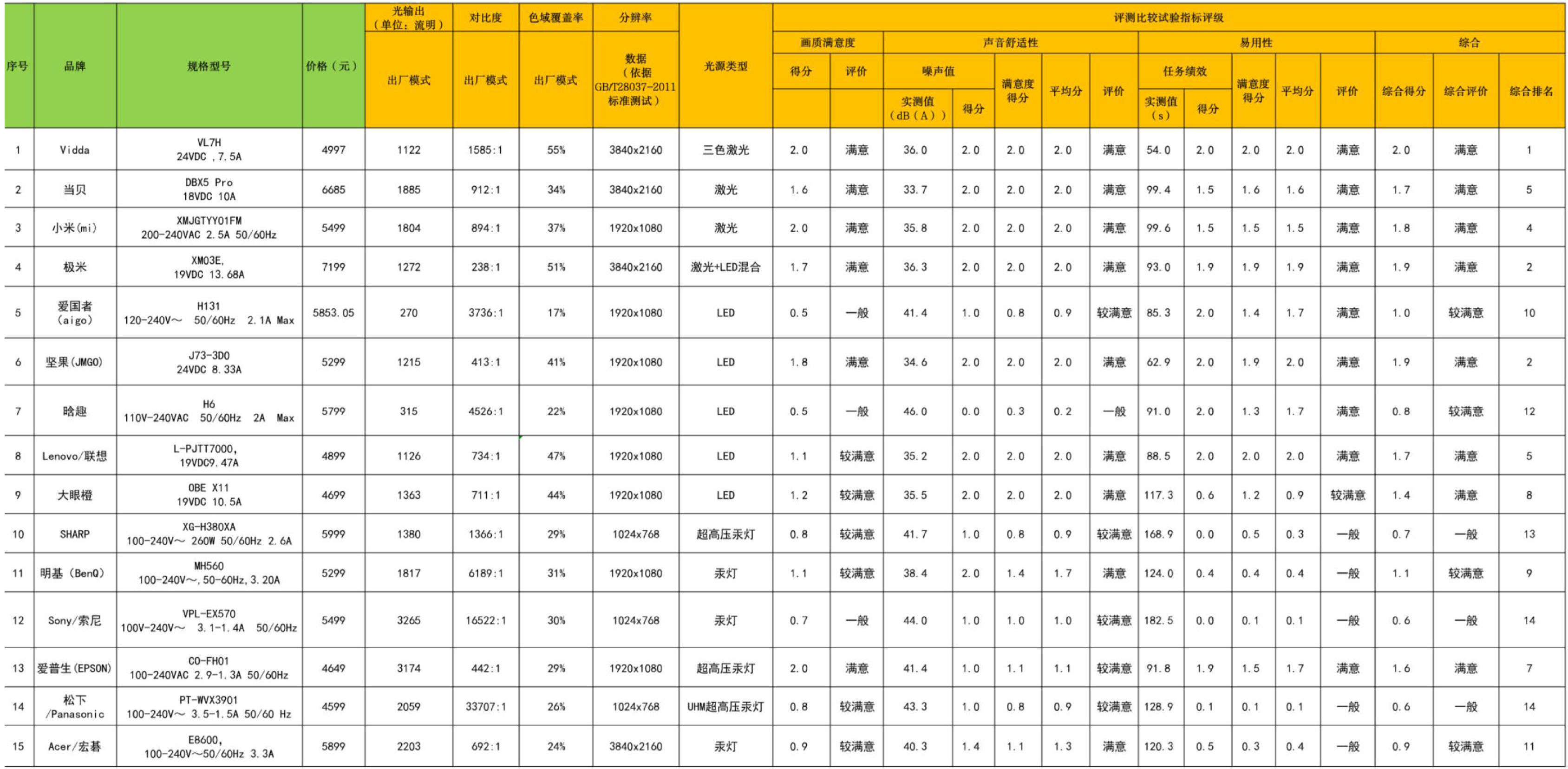 近年来,投影仪已在国内显示设备市场占据了一席之地,相对于传统的屏幕类产品,消费者对其优劣知之不深。为此,北京市消费者协会对市场上销售的15个品牌投影仪产品开展了商品比较试验。具体结果如下:
