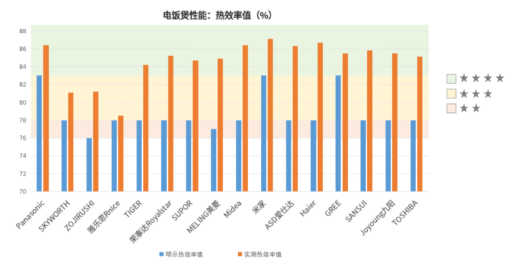 本次对购买的16台电饭煲样品进行检验,有13台电饭煲的热效率值测试结果大于83%,满足能效等级中的2级要求;另外3台电饭煲的热效率值测试结果大于78%,满足能效等级中的3级要求。从产品的明示能效等级来看,本次16台电饭煲中有12台产品明示3级,其中10台实测值达到了2级水平,另外2台实测值在3级;有1台产品明示4级,实测值达到了3级水平;有3台产品明示2级,实测值也在2级水平。