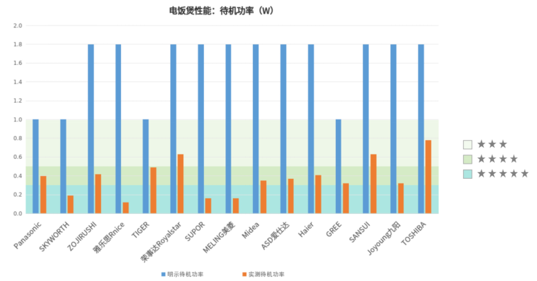 本次测试中,有1台电饭煲样品带有Wi-Fi通讯协议功能,待机功率测试项目不适用,未进行结果统计,其余15台电饭煲样品的待机功率均小于1.0W,满足能效等级中的2级要求。