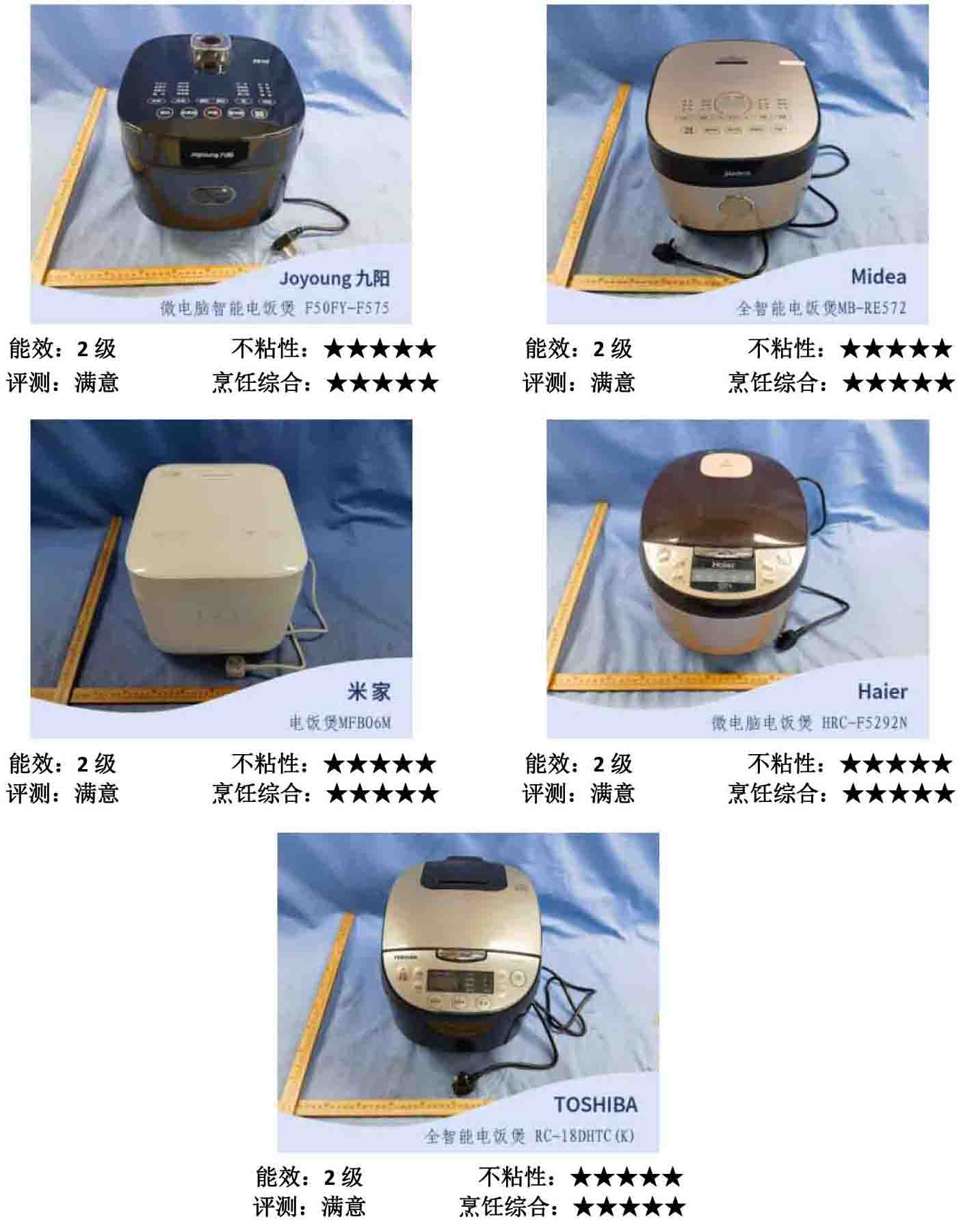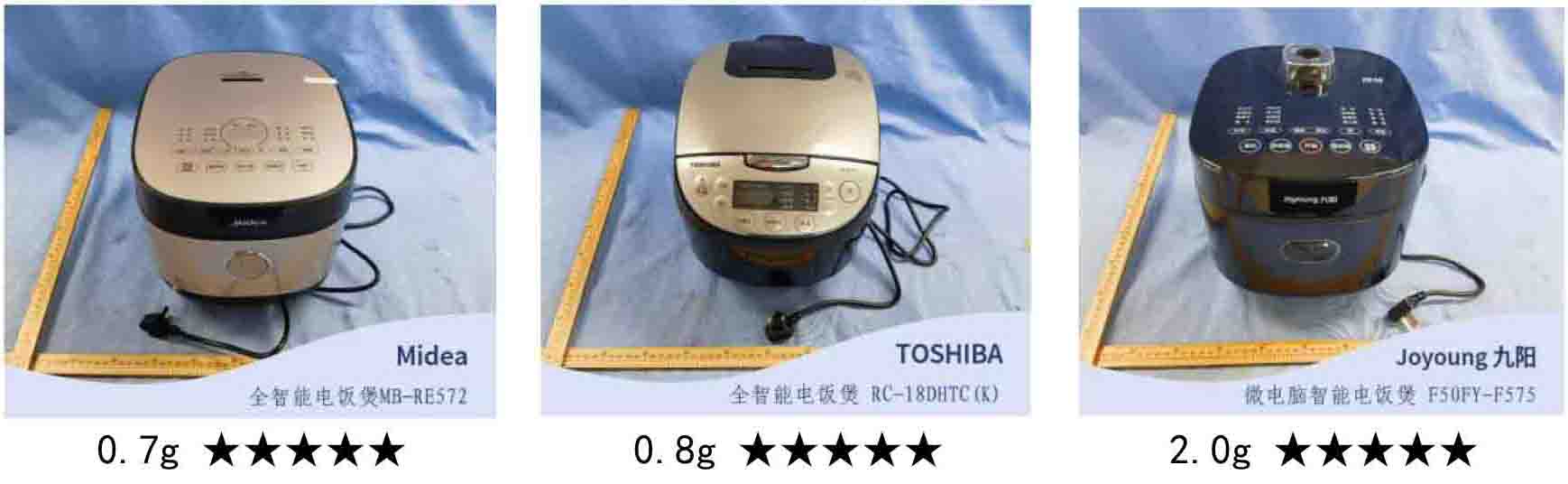 其中,“Midea”牌MB-RE572型全智能电饭煲、“TOSHIBA”牌RC-18DHTC(K)型全智能电饭煲、“Joyoung九阳”牌F50FY-F575型微电脑智能电饭煲的测试结果小于等于2g,表现较为优异。