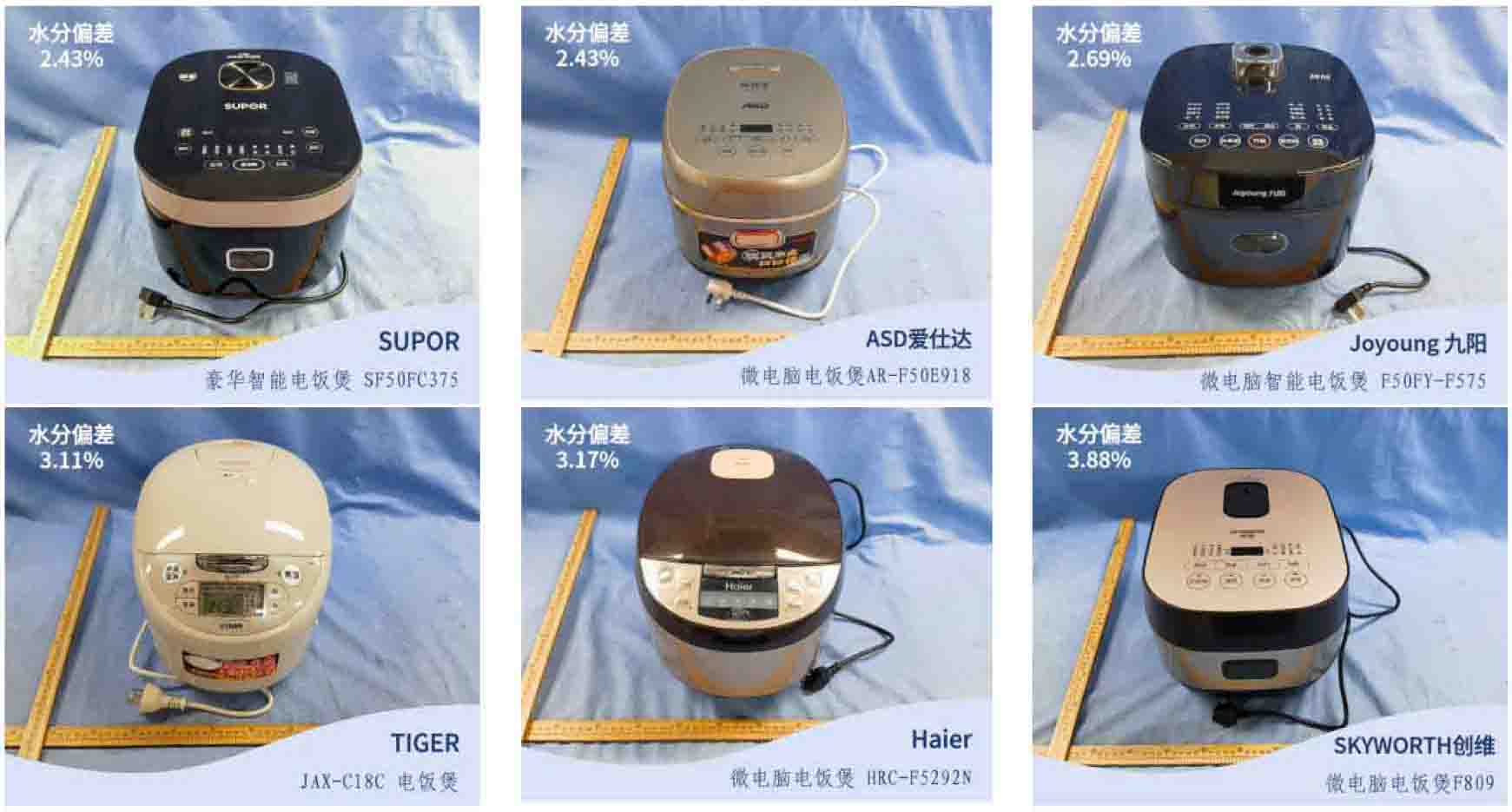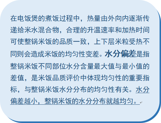 国家标准 GB/T 40978-2021《电饭锅》要求粳米的水分偏差≤10%,本次测试结果16台电饭煲样品的水分偏差均满足标准要求。其中,“SKYWORTH”牌F809型微电脑电饭煲、“TIGER”牌JAX-C18C型电饭煲、“SUPOR”牌SF50FC375型豪华智能电饭煲、“ASD爱仕达”牌AR-F50E918型微电脑电饭煲、“Haier”牌HRC-F5292N型微电脑电饭煲、“Joyoung九阳”牌F50FY-F575型微电脑智能电饭煲的测试结果最好,达到了5%以内。