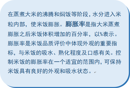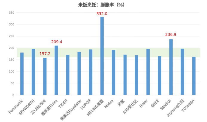 国家标准 GB/T 40978-2021《电饭锅》要求粳米的膨胀率在160%至200%范围内,本次测试结果12台电饭煲样品的膨胀率满足标准要求;“ZOJIRUSHI”牌NS-YSH18C型微电脑电饭煲的测试结果低于160%;3台电饭锅样品的膨胀率测试结果高于200%,其中,“MELING美菱”牌MF-B503E型智能电饭煲的测试结果超过300%。