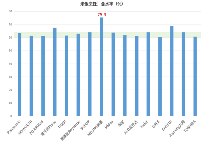 国家标准 GB/T 40978-2021《电饭锅》要求粳米的含水率在60%至64%范围内,本次测试结果13台电饭煲样品的含水率满足标准要求;3台电饭煲的测试结果大于64%,其中,“MELING美菱”牌MF-B503E型智能电饭煲的测试结果超过75%。