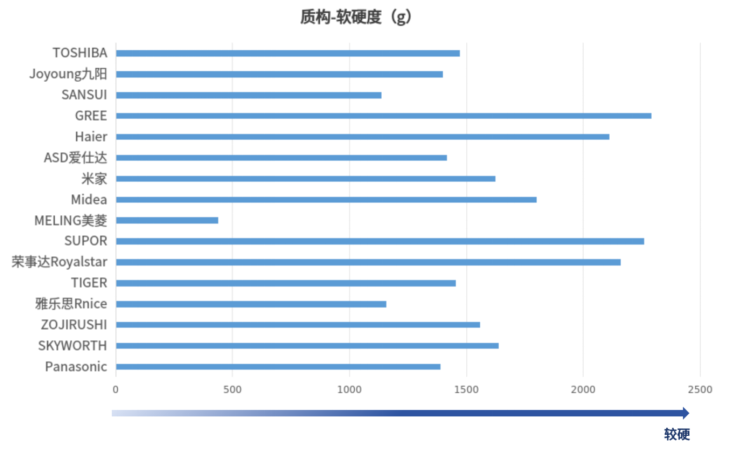 本次测试中,有4台电饭煲样品的软硬度结果在2000g-2300g范围内;4台电饭煲样品的软硬度结果在1500g-2000g范围内;7台电饭煲样品的软硬度结果在1000g-1500g范围内;“MELING美菱”牌MF-B503E型智能电饭煲的米饭最软,软硬度结果低于500g。