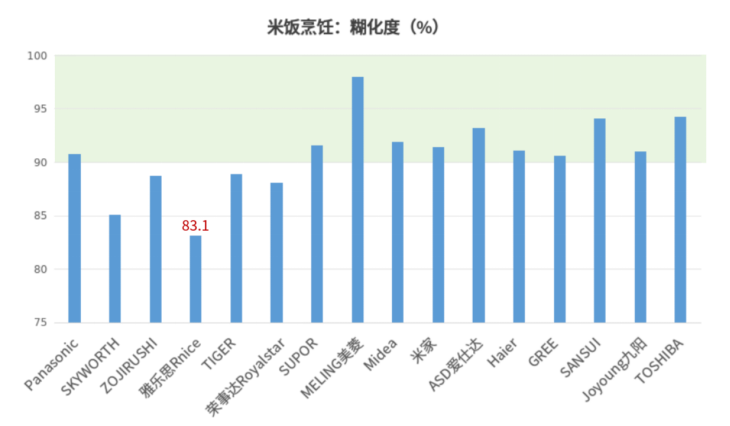 国家标准 GB/T 40978-2021《电饭锅》要求粳米的糊化度≥90%,本次测试结果11台电饭煲样品的糊化度满足标准要求;5台电饭煲样品的糊化度结果低于90%,其中,“雅乐思Rnice”牌YF50-M16型多功能电饭煲的测试结果低于85%。