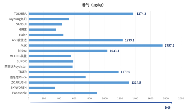 香气指米饭开盖后散发出的气味强度,用米饭经萃取后顶空取样提取的总挥发性成分含量表示。米饭中呈香物质的质量浓度,可以反映米饭香气的强弱。本次测试中,“ZOJIRUSHI”牌NS-YSH18C型微电脑电饭煲、“TIGER”牌JAX-C18C型电饭煲、“Midea”牌MB-RE572型全智能电饭煲、“米家”牌MFB06M型智能快煮电饭煲、“ASD爱仕达”牌AR-F50E918型微电脑电饭煲、“TOSHIBA”牌RC-18DHTC(K)型全智能电饭煲的香气结果均大于1000μg/kg,结果较好。其余10台电饭煲样品的香气结果在300μg/kg-1000μg/kg。