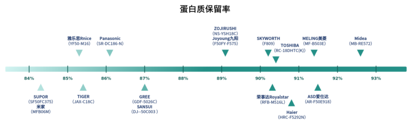 蛋白质保留率反映电饭煲在煮牛肉过程中的营养保留效果。蛋白质作为一切生物体的重要组成成分,是营养素之一,对食品的色、香、味及组织结构等具有重要意义。蛋白质保留率越高,电饭煲在煮牛肉过程中营养保留效果越好。本次测试中,有7台电饭煲的蛋白质保留率大于90%,其中“Midea”牌MB-RE572型全智能电饭煲的结果最好,达到了92.6%。其余9台电饭煲的蛋白质保留率结果在80%-90%之间。