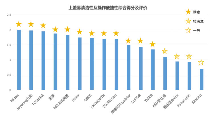 随着消费者对产品体验要求的提高,电饭煲上盖的污渍是否容易清洁,是否存在清洁死角等问题的关注度逐渐升高。上盖易清洁性指标由工程师记录用户完成上盖清洁任务的任务绩效;以及用户通过上盖清洁任务操作对电饭煲的上盖易清洁性进行满意度评判。完成任务的时间越短,满意度越高,表明电饭煲上盖清洁操作逻辑越清晰,用户对该电饭煲上盖进行拆卸、清洁等操作越容易。本次测试的16台电饭煲中,有9台样品清洁上盖操作的任务绩效<20s,满意度评价为满意;3台清洁上盖操作的任务绩效在20s-25s之间,评价为较满意;4台清洁上盖操作的任务绩效>25s,评价为一般。