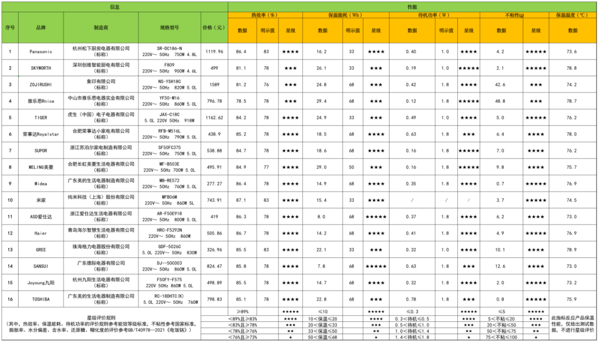本次比较试验委托中家院(北京)检测认证有限公司对电饭煲样品的热效率值、保温能耗、待机功率、保温温度、煮米饭不粘性、膨胀率、水分偏差、含水率、还原糖、糊化度、质构、香气(挥发性香味)、呈甜味氨基酸、蛋白质保留率、咀嚼性、上盖易清洁性、操作便捷性项目进行了测试。比较试验结果仅对购买的样品负责。