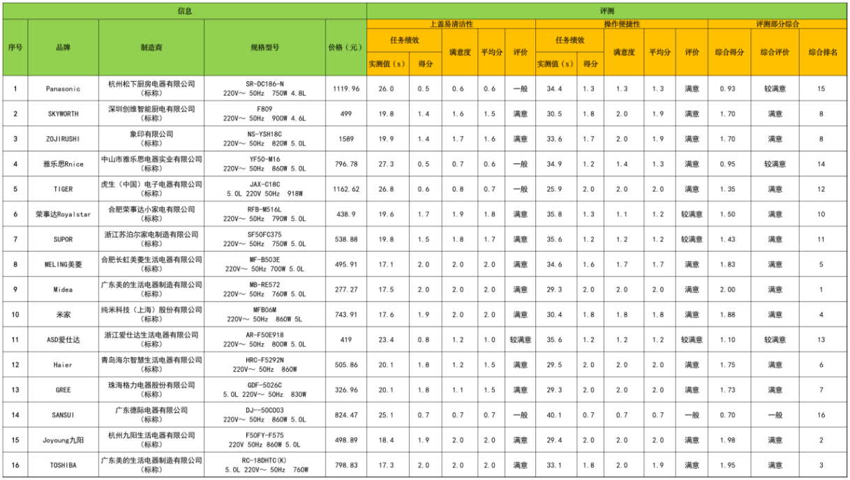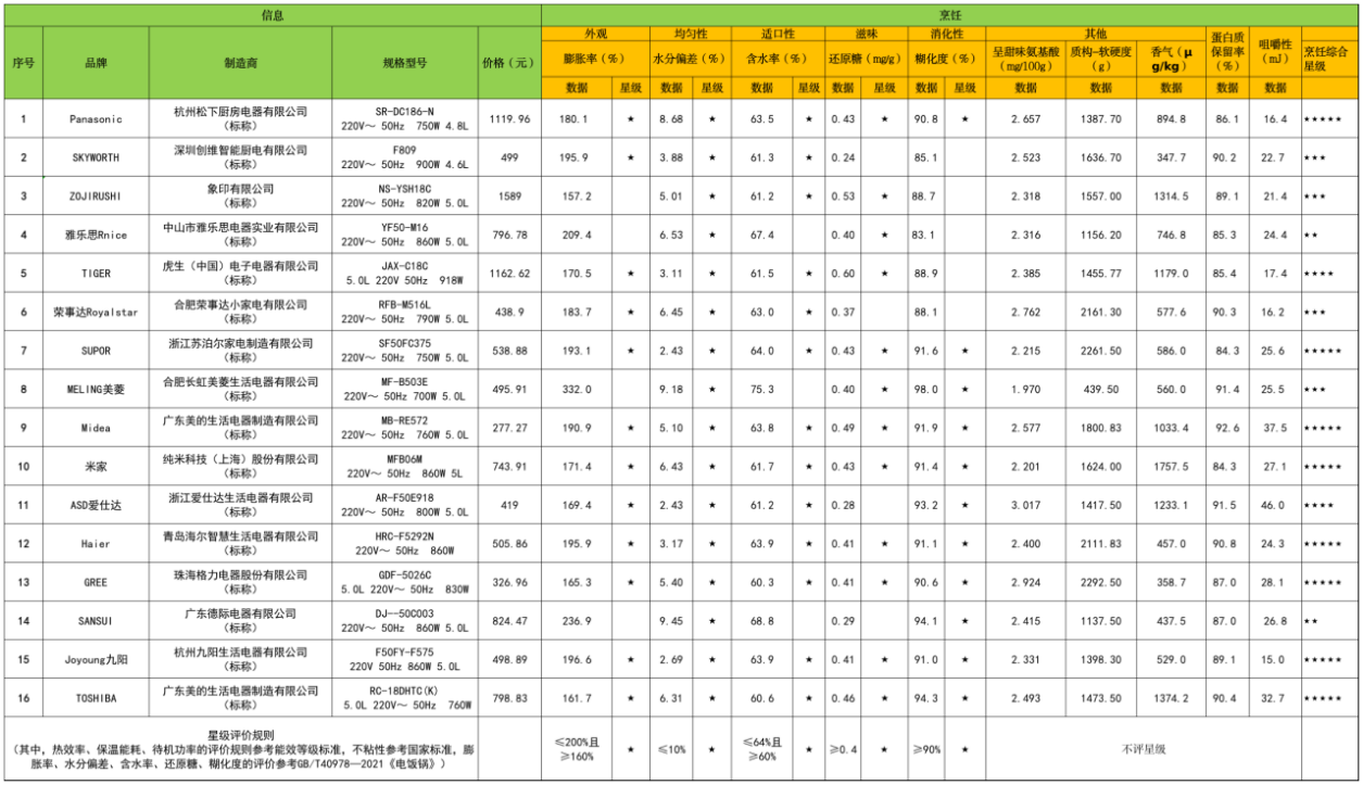 比较试验样品由京津冀三地消协组织的工作人员以普通消费者的身份从电商平台购买,包括16台明示额定容积3L<V<6L、额定功率在600W<P≤1000W范围内,内锅材质为金属且带有涂层的产品,涉及16个品牌,购买价格从277元/台到1589元/台。